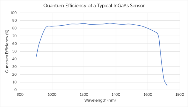 InGaAs傳感器的帶隙能量通常低于硅,這意味著它們能夠檢測更長的波長,例如短波紅外(SWIR)區(qū)域(900-1700nm)。因此,InGaAs傳感器在950-1600nm區(qū)域內(nèi)的QE>80%。如圖顯示了典型InGaAs傳感器的QE曲線。